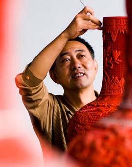 张来喜,1961年出生于扬州。中国工艺美术大师、中国漆艺委员会委员、享受国务院特殊津贴专家、全国五一劳动奖章获得者、研究员级高级工艺师、省级“非遗”传承人等。领衔复制故宫檀木龙椅,在红雕漆领域拥有三大专利作品。