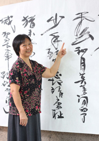 擅书法,书法中有男子气度,注重大布局,篇章行字,黑白粗细,大张大合,注重大节奏,长短疏密,轻重缓急,大笔大墨,一如她的大写意花鸟。